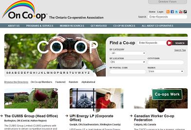 The Ontario Co-operative Association has a nicely designed "eDirectory" for finding cooperatives in the province. Categorization tags are done by the businesses market (Dairy) rather then by cooperative sector (Consumer). The directory is complemented by educational and promotional materials. Updates can be emailed to them, centralizing maintenance, though it probably helps that all co-operatives must register with the provincial government, unlike the United States where there is no governmentally maintained list.
